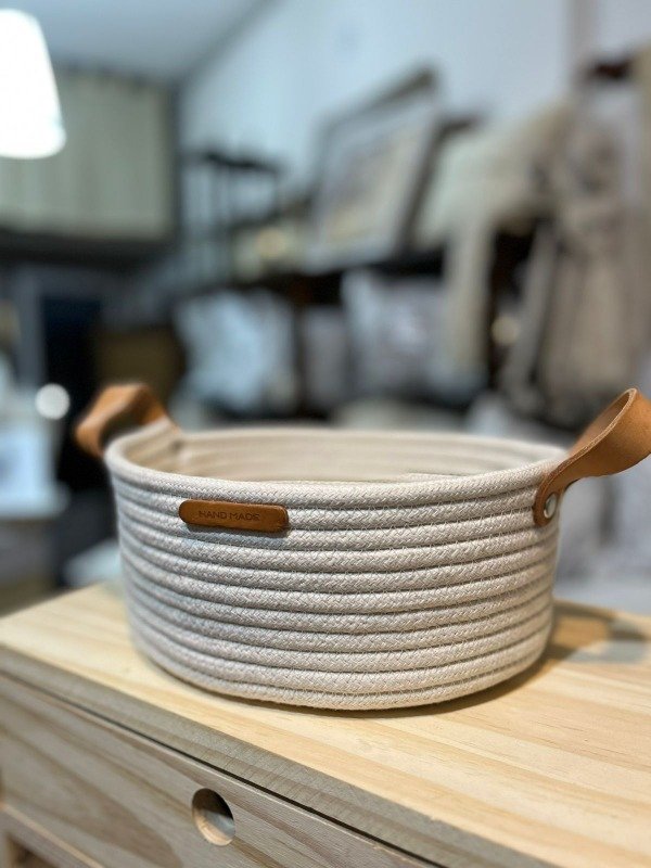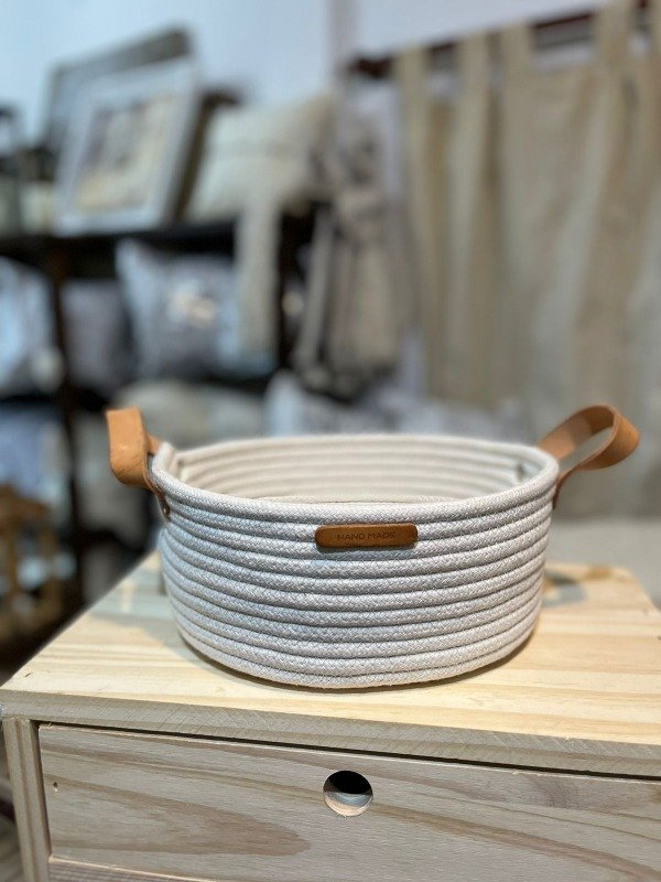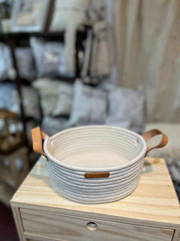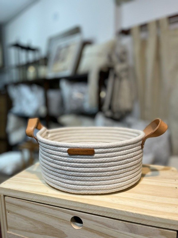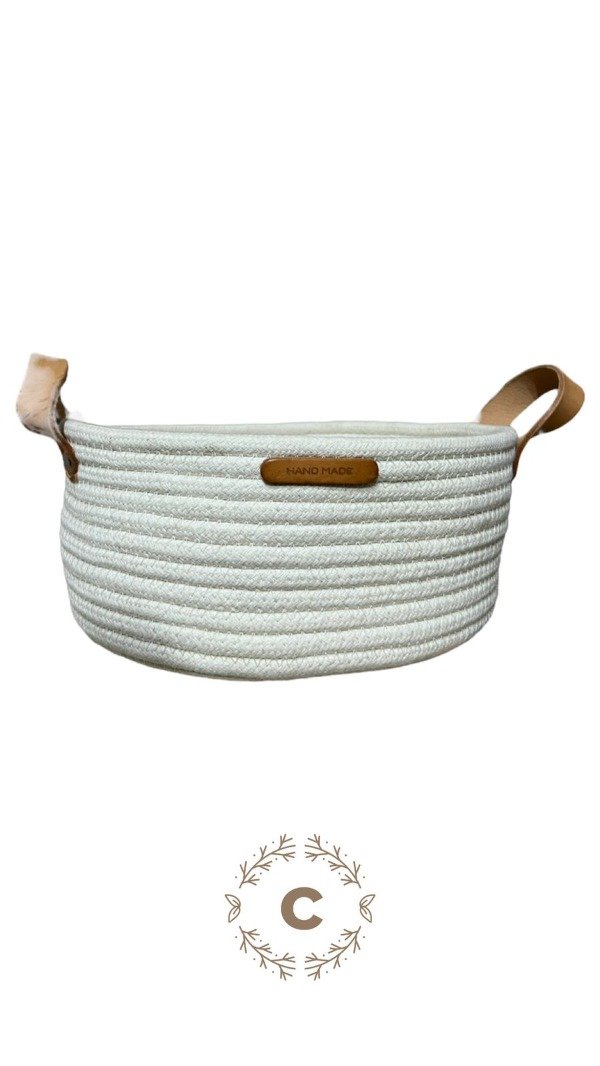 Cesta hilo de algodon, con manijas de cuero, forma levemente ovalada.